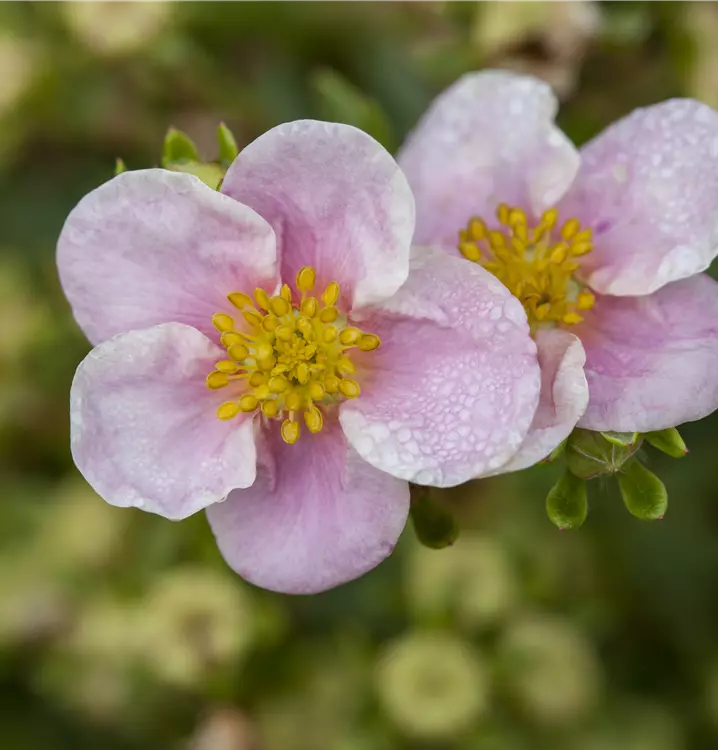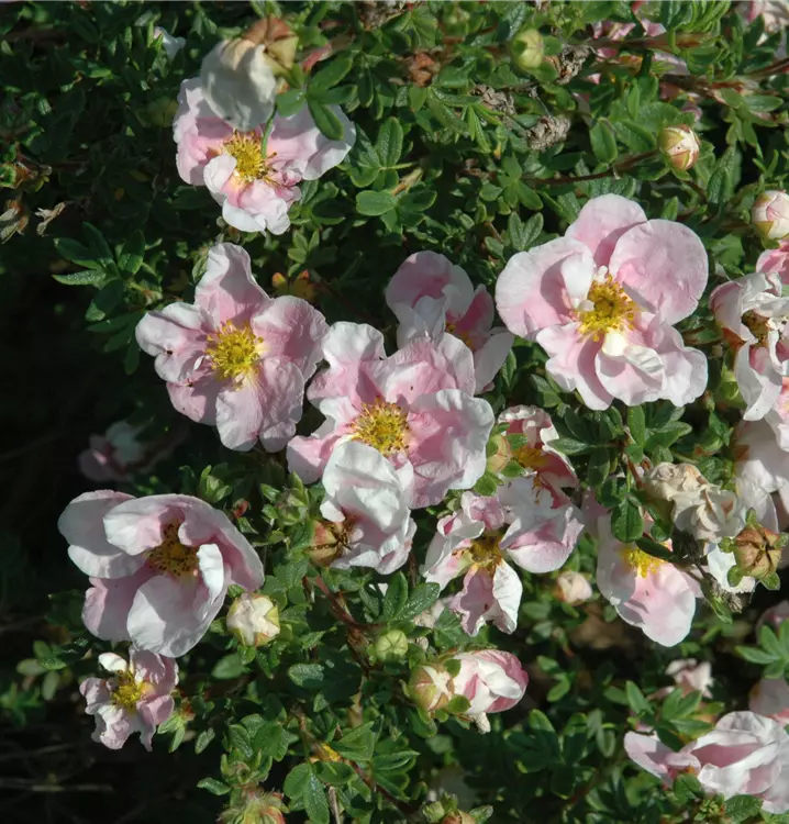 Der Fingerstrauch 'Princess'® (Potentilla fruticosa) ist ein buschiger, breiter Kleinstrauch, der rosafarbene, schalenförmige Blüten hervorbringt. Sie erscheinen von Mai bis November. Zudem trägt der Fingerstrauch 'Princess'®, gefingerte, dunkelgrüne Blätter. An einem sonnigen bis halbschattigen Standort mit durchlässigem, nährstoffreichem, schwachsaurem Boden erreicht er gewöhnlich eine Höhe von ca. 80 cm und wird ca. 1,2 m breit.