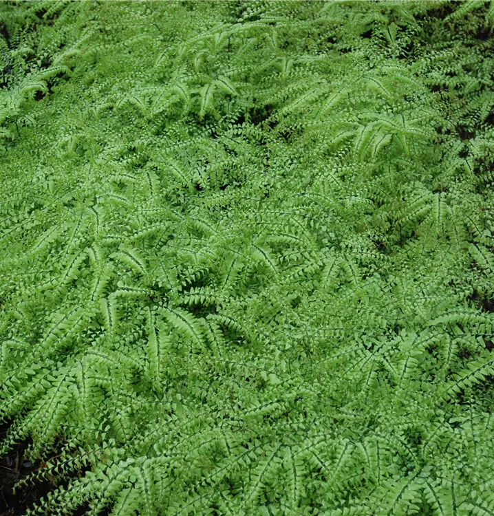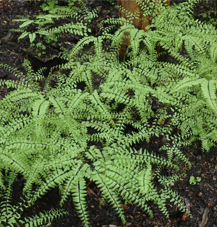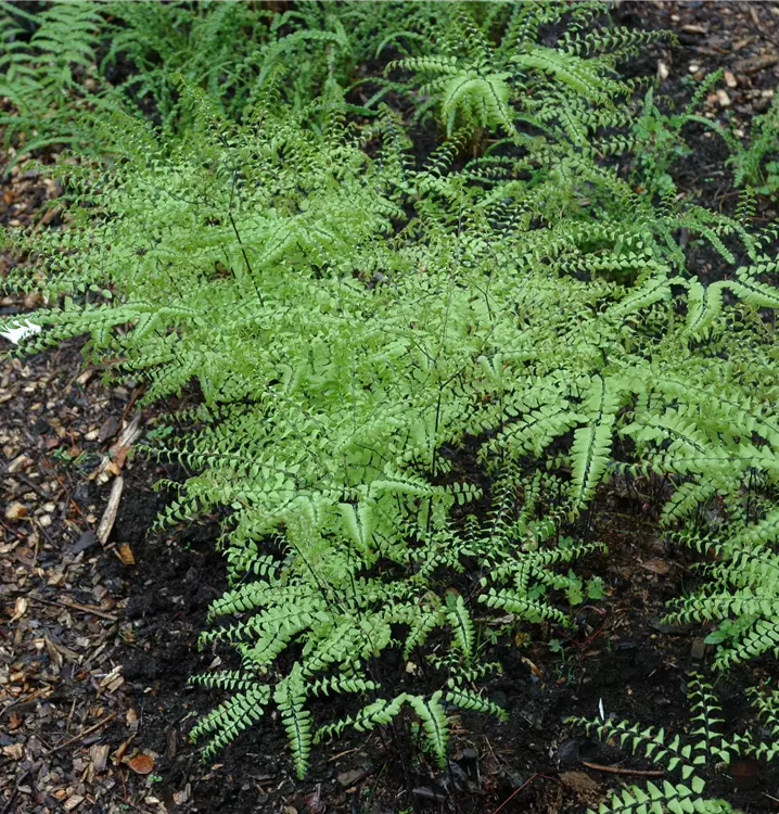 Der Pfauenradfarn (Adiantum pedatum) ist mit seinen gefiederten, hellgrünen Blattwedeln ein dekoratives Gestaltungselement im Garten. Interessante Details sind die schwarzen Blattstiele. An einem halbschattigen Standort mit einem möglichst durchlässigen, kalkfreien Boden fühlt er sich am wohlsten. Bei günstigen Bedingungen erreicht dieser winterharte Farn eine Höhe von ca. 50 cm und wird bis zu 40 cm breit.