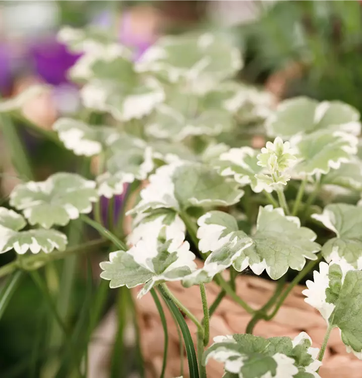 Der Weißbunte Gundermann 'Variegata' (Glechoma hederacea) besitzt dekorative, grau-grüne Blätter. Sie sind rundlich und gewellt. Die gesamten Saison über bildet er zudem unzählige blauviolette Blüten. Ein sonniger bis halbschattiger Standort und ein durchlässiges Substrat werden bevorzugt. Mit seinem hängenden Wuchs passt der Weißbunte Gundermann 'Variegata' besonders gut in Blumenampeln und hängende Pflanzkörbe.