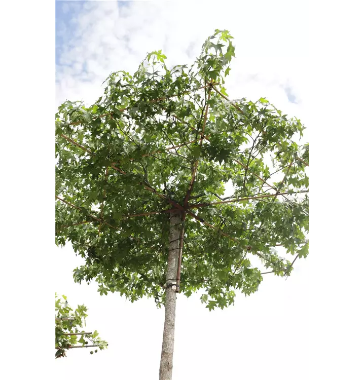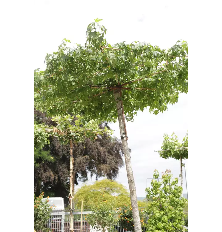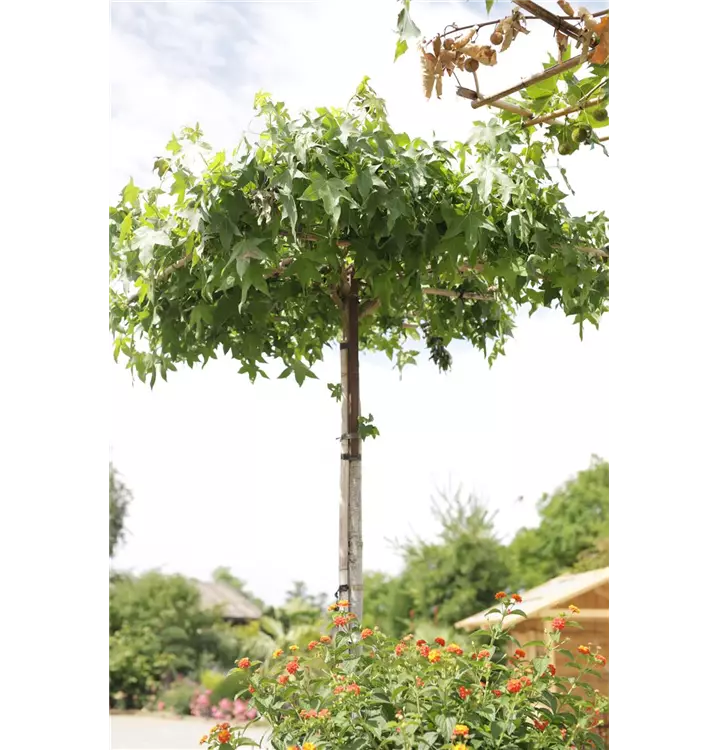 Der Amberbaum in Dachform ist ein stilvoller Schattenspender mit besonderem Zierwert. Seine charakteristische, schirmartige Krone sorgt für angenehmen Schatten, während die markante, korkartige Rinde und die dekorativen Korkleisten an Ästen und Stamm ihn zu einem echten Blickfang machen.