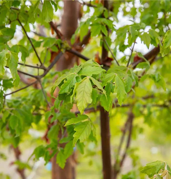 Die Triebe von Acer griseum sind glatt, rot-braun.