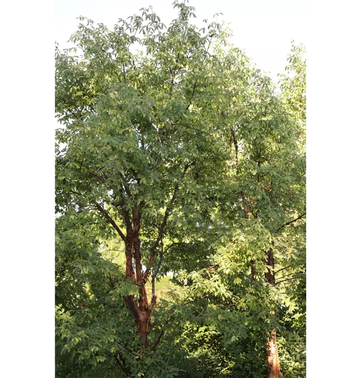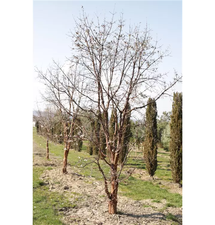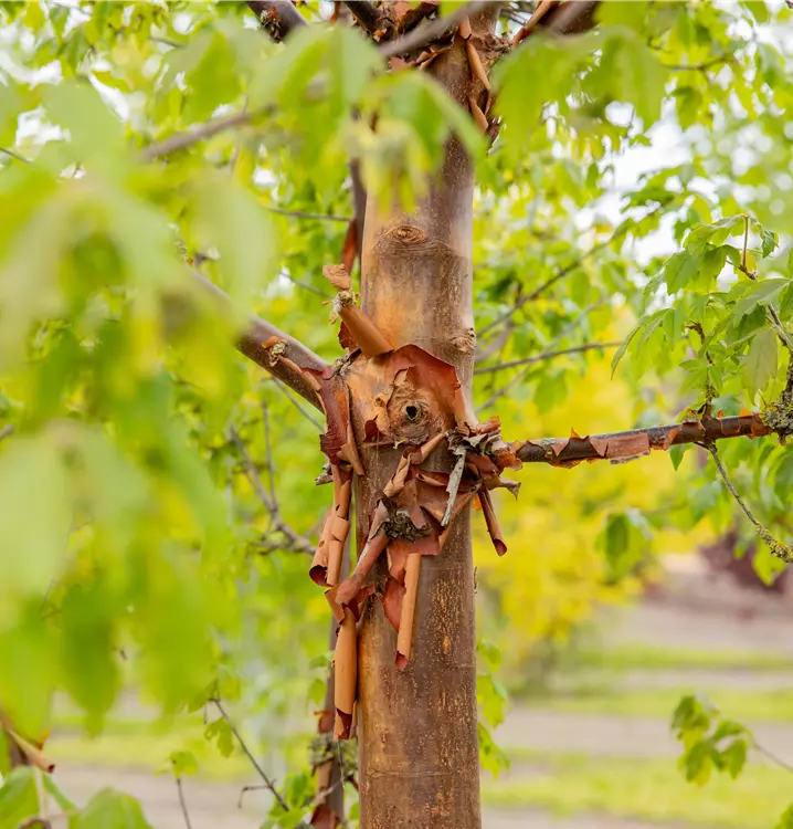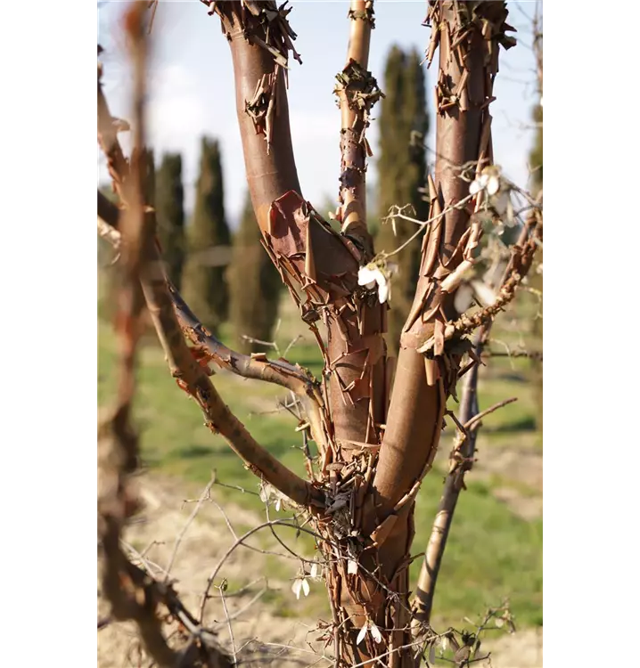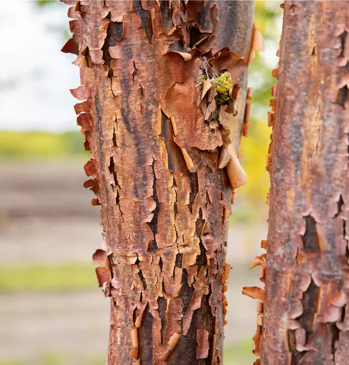 Braun, abrollende Rinde macht diese Pflanze zu einem Blickfang in jedem Garten.