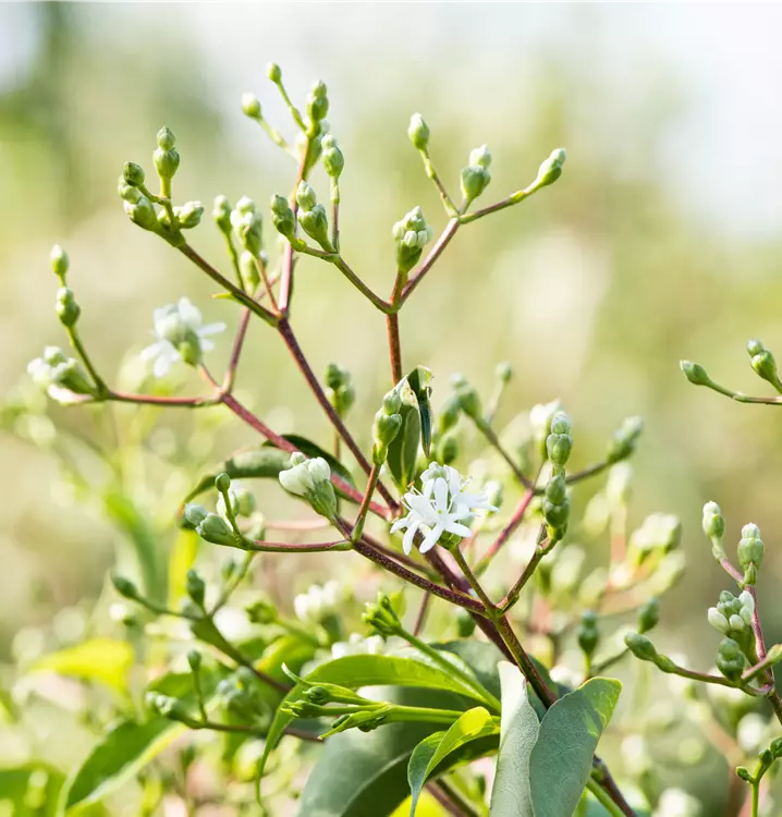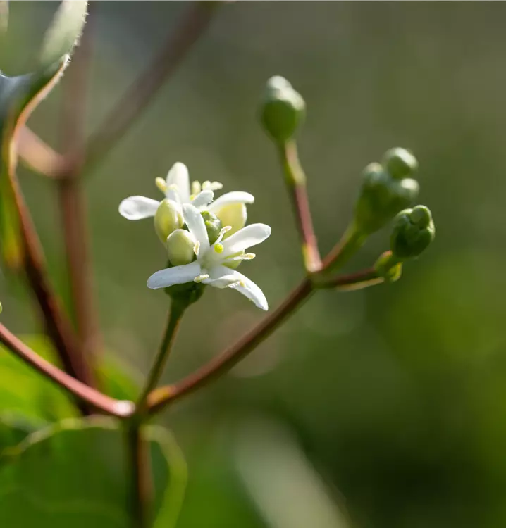 Die cremeweißen Blüten des Sieben-Söhne-des-Himmels-Strauch erscheinen in Rispen von August bis September. Diese sind stark duftend.