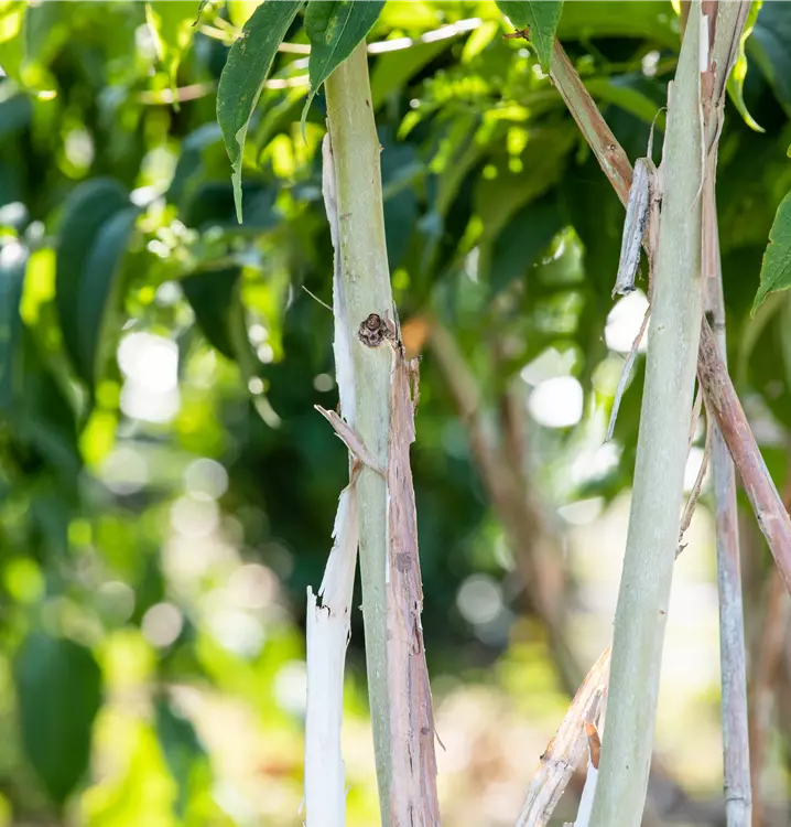 Braun-gelb, abblätternde Rinde macht diese Pflanze zu einem Blickfang in jedem Garten.