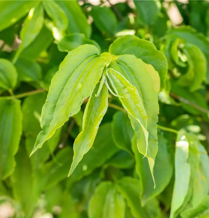 Die sommergrünen Blätter des Sieben-Söhne-des-Himmels-Strauchs sind dunkelgrün, eiförmig, gegenständig. Diese sind etwa 7 - 10 cm groß. Lange haftend.