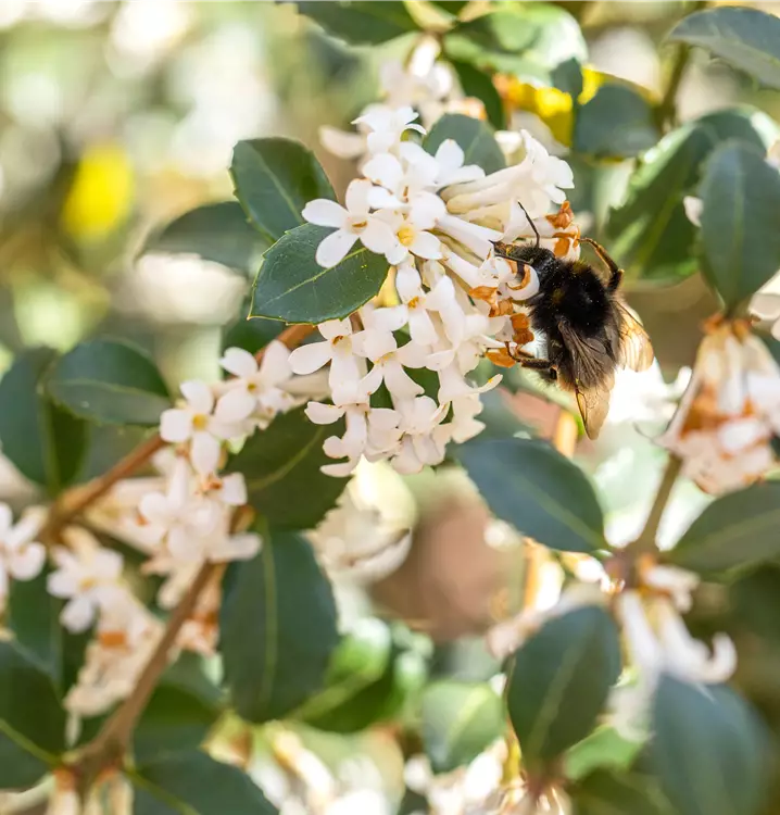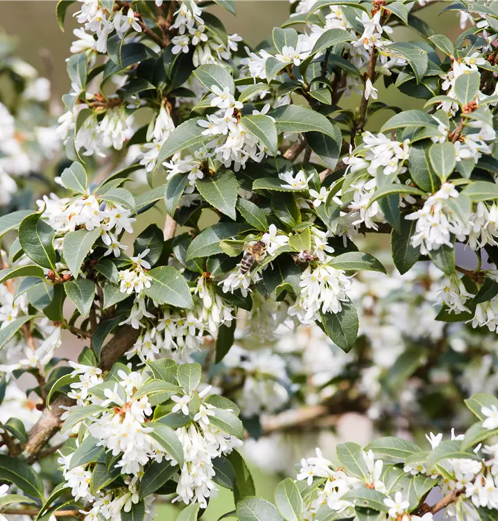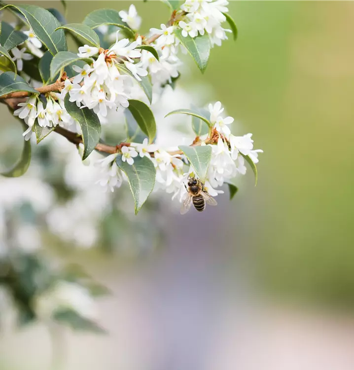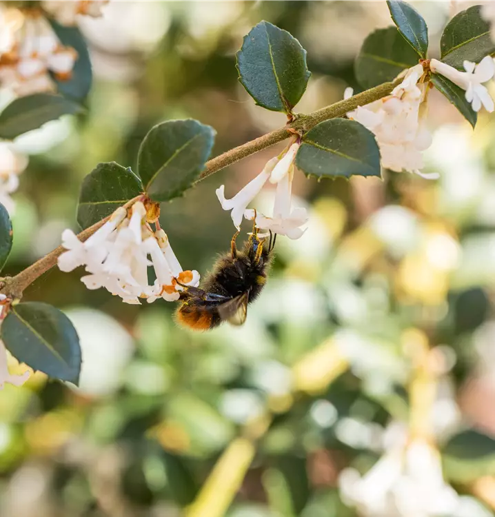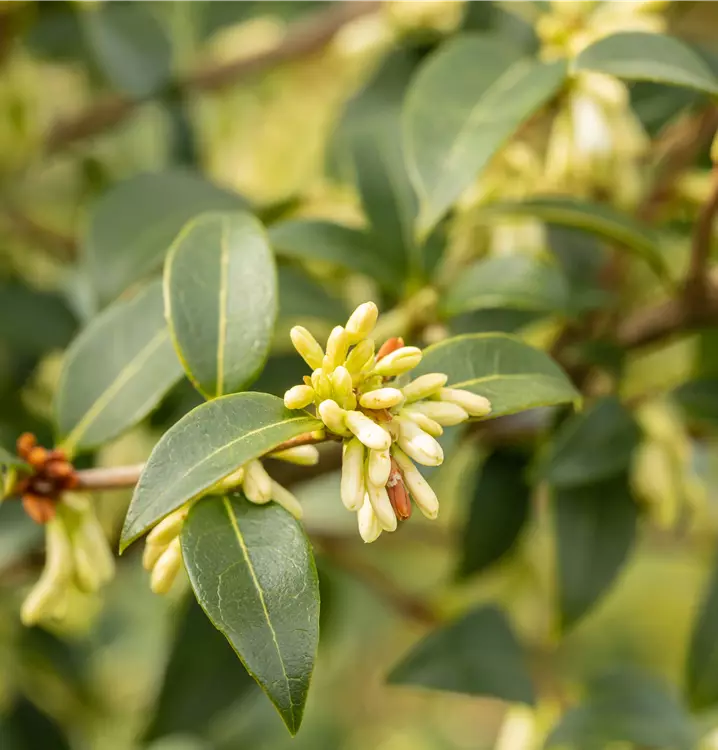 Die Burkwoods Duftblüte (Osmanthus burkwoodii) ist ein buschiger, breiter Großstrauch, der weiße Blüten mit einem starken Duft hervorbringt. Sie erscheinen von April bis Mai. Zudem trägt die Burkwoods Duftblüte, glänzende, eiförmige, dunkelgrüne Blätter. An einem halbschattigen bis schattigen, windgeschützten Standort mit durchlässigem, humosem Boden erreicht sie gewöhnlich eine Höhe von ca. 5 m und wird ca. 5 m breit.