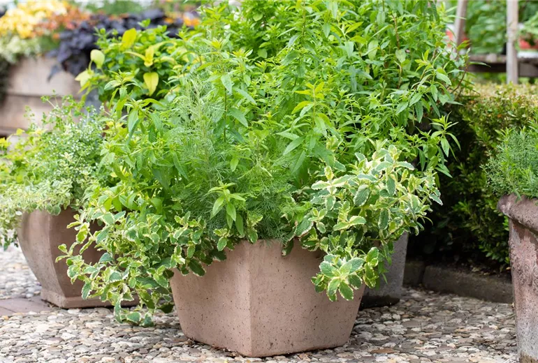 Angenehm unkompliziert ist die mehrjährige Zitronenmelisse, die auch im lichten Schatten gut wächst. Wird dieses Kraut vor der Blüte knapp über dem Boden gekappt, kann man bis zu drei Ernten erreichen. In Salaten, Suppen und Soßen wird gerne Kerbel verwendet, da er für ein feines Anis-Aroma sorgt. Kerbel wächst schnell und kann von März bis Juni alle drei bis vier Wochen neu ausgesät werden.
